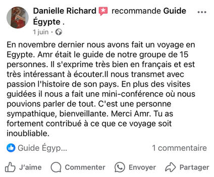 "Je suis Amr guide égyptologue francophone. Originaire d'Égypte, je connais mon pays dans les moindres détails et partage son histoire avec enthousiasme. Ma passion pour la culture égyptienne ancienne comme contemporaine rend chaque visite unique et vivante."